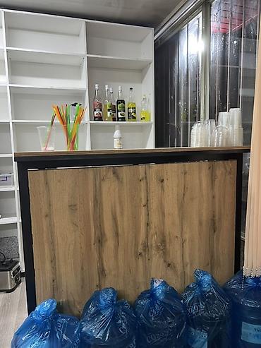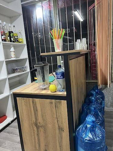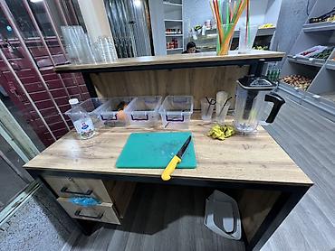 - Рабочая зона: широкая столешница, разделочная доска, нож; размещены емкости‑органайзеры для ингредиентов, держатели для одноразовых стаканов и трубочек.