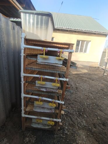 - Встроенная система поения: пластиковый бак-резервуар сверху, разводка ПВХ-труб, ниппельные поилки с желтыми чашечками на каждом ярусе