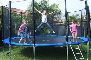 Идеален для активных игр детей, тренировки координации и кардио-нагрузки. Простая сборка/разборка. Комплект: каркас, прыжковое полотно, пружины, защитный мат, стойки, сетка, лестница, крепёж.