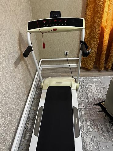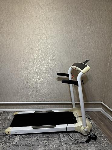 - Электрическая беговая дорожка с компактной рамой и поручнями.