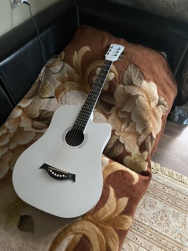 Акустическая гитара 4/4, цвет белый, форма корпуса Dreadnought с вырезом (cutaway). 6 струн, металлические колки, накладка темного цвета, розетка с декоративным орнаментом. Подставка классическая с белыми пинами.