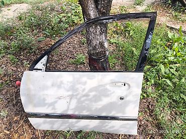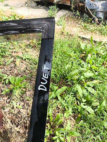 Taiota DUET Дверь автомобиля в белом цвете, с черными элементами. На двери видна надпись "DUET", что указывает на марку автомобиля. Дверь оснащена ручкой и замком, а также молдингом в нижней части. Подходит для замены поврежденной двери или для восстановления автомобиля.
