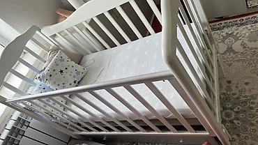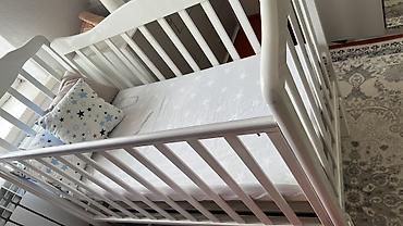 Детская кроватка белого цвета с продольными рейками и округлыми бортами. Один бок опускаемый — удобно для ухода за малышом или приставного использования к родительской кровати. Основание реечное, обеспечивает вентиляцию матраса. В комплекте матрас стандартного детского размера; на матрасе натянут белый простынный чехол с рисунком звёзд. Конструкция из прочного массива/МДФ (визуально — дерево), гладкое покрытие, безопасные закруглённые углы. Подходит для новорождённых и детей до дошкольного возраста. Цвет универсальный, легко впишется в любой интерьер детской. Возможно использование с бортиками/подушками-аксессуарами (на фото декор со звёздами).