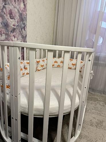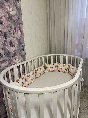 - Комплектация на фото: круглый/овальный матрас, мягкие защитные бортики-подушки с принтом лисичек, простыня.