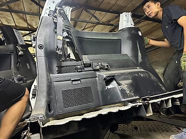 Белая боковая часть кузова автомобиля, предназначенная для установки на правую сторону транспортного средства. Включает в себя элементы двери, оконные проемы и часть задней арки. Оснащена внутренними панелями, креплениями для ремней безопасности и элементами для стакана. Подходит для замены поврежденных секций кузова или для использования в проектах по восстановлению автомобилей.