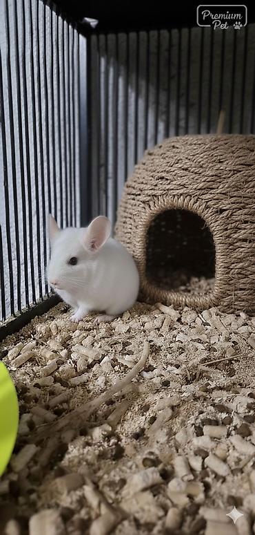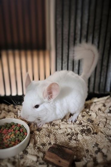 - Неприхотлива в уходе: требуется просторная клетка с полками, деревянные домики и жёрдочки, поилка, миска, песок для купания, сено высокого качества и специализированный корм для шиншилл.