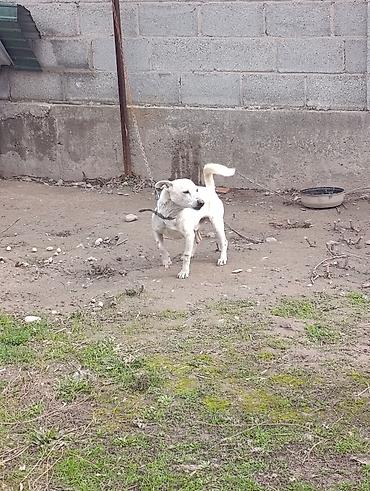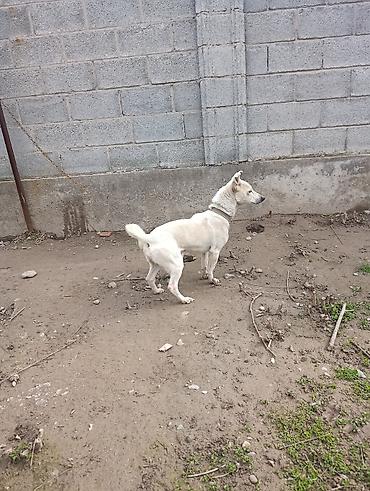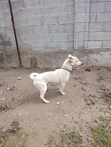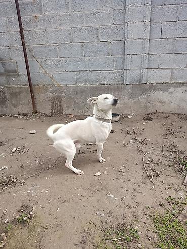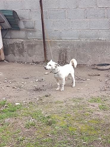 Белая собака небольшого/среднего роста, короткошёрстная. Компактное, мускулистое телосложение, пропорциональная голова, стоячие уши с лёгким залом, тёмная мочка носа. Хвост загнут кольцом. На шее ременной ошейник, собака содержится на цепи. Активная, бдительная, хорошо ориентируется на участок — подойдёт как дворовый сторож и компаньон. Короткая шерсть проста в уходе; окрас однотонный светлый с чуть темнее ушами и мордой. Судя по кадрам, собака уверенно стоит на лапах, реагирует на звуки и движения, держится близко к дому.