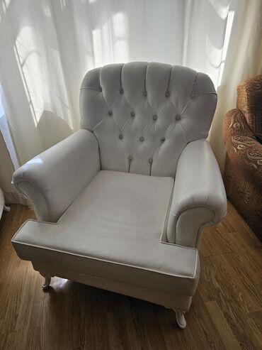 Элегантное кресло белого цвета с изогнутыми подлокотниками и удобной подушкой, дополненное круглой оттоманкой. Обивка из мягкого, текстурированного материала придает комплекту уютный вид. Этот комп...