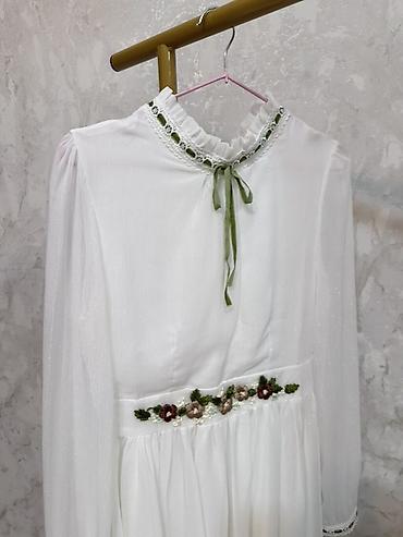 - Декор: вышитый пояс-лента по линии талии с объемными цветами, листьями и жемчужными бусинами; кружевные вставки с зелёной лентой по воротнику и манжетам