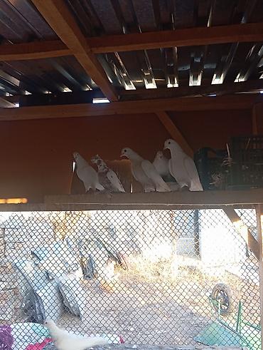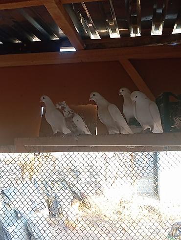 Пара декоративных голубей белого окраса. Характеристики: - Плотное белое оперение, легкие серые вкрапления на шее у одной птицы - Богатые «чубуки» на лапах (оперённые ноги) - Крупная, правильная п...
