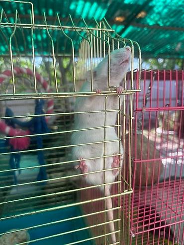 Белые домашние крысы для содержания в качестве питомцев. Эти грызуны отличаются социальным поведением и чистоплотностью, что делает их подходящими для домашней среды. Они легко приручаются и могут стать отличными компаньонами для любителей животных. Крысы содержатся в просторной клетке с игрушками, что обеспечивает им комфортные условия.
