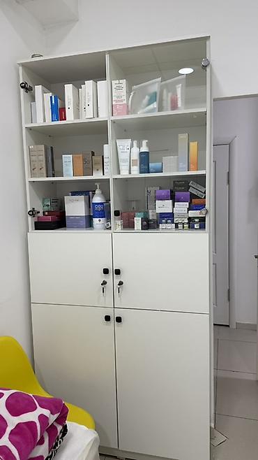 - Верхняя часть с прозрачными дверцами: четыре секции с полками для демонстрации и хранения косметики, медикаментов, расходников, документов.