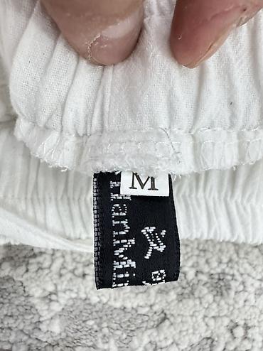 Размер не указан на фото; ориентируйтесь по эластичному поясу и прямому крою.