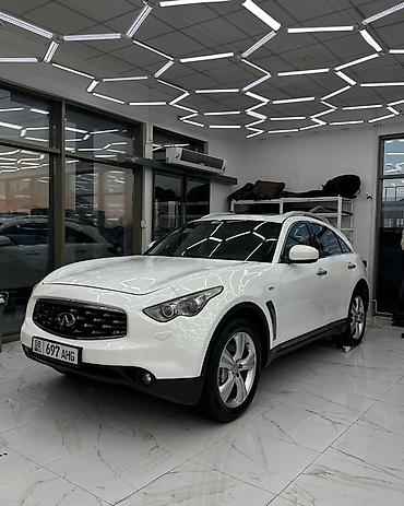 Infiniti FX35, белый кроссовер Основные характеристики: - Кузов: 5‑дверный кроссовер, белый цвет, тонировка задних стекол, спойлер на крыше - Полный привод (AWD) - Двигатель бензиновый V6 3.5 л - ...