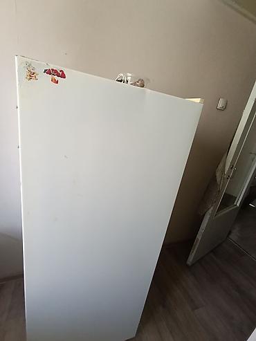 Однокамерный холодильник белого цвета (без морозильной камеры или с малой верхней морозилкой — классическая «однодверка»). Корпус прямоугольный, дверь распашная, петли слева. На верхней кромке видна механическая панель управления/терморегулятор, есть полка-«крышка» для хранения мелочей. Стандартная высота для узкого холодильника, ориентировочно около 140–160 см, ширина около 55–60 см, глубина около 55–60 см.