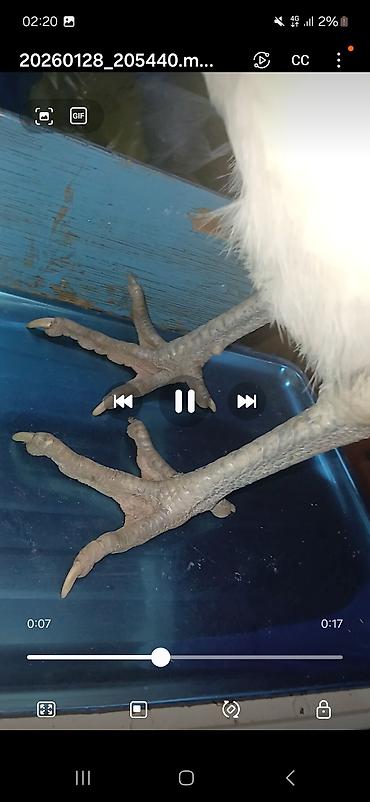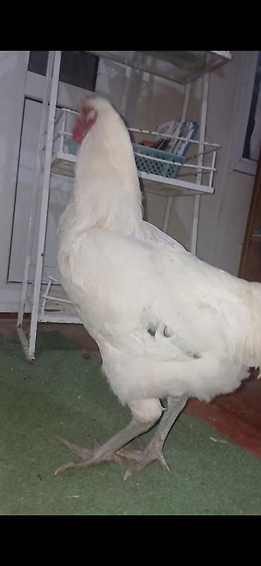 Крупный декоративно-мясной петух породы брама. Описание: - Окрас: светлый (белый) с контрастным темно-серым/черным оформлением гривы и хвоста. - Выраженный гребень и сережки ярко-красного цвета. -...