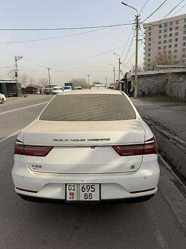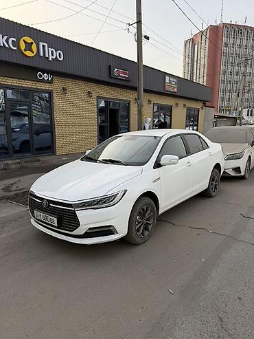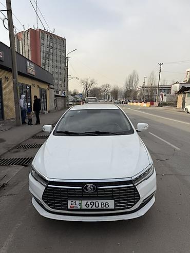 Белый седан BYD Qin Plus (поколение с узкими светодиодными фарами и крупной чёрной решёткой радиатора). Основные особенности: - Кузов: 4-дверный седан, белый цвет, аэродинамичный дизайн с длинными...