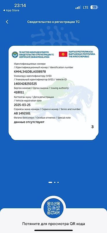 - Регистрация: свидетельство о регистрации ТС Кыргызской Республики от 2025-03-25; VIN KMHL341DBLA008978 (указан на электронном свидетельстве фото)