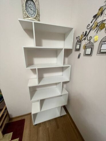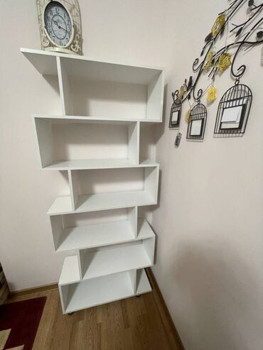 Белый стеллаж с дизайнерской «зигзагообразной» компоновкой полок.