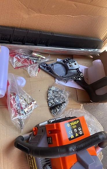 - В наборе также показана аналогичная пила оранжевого цвета 7500 (на заднем плане) и базовый инструмент/расходники в пакетах.