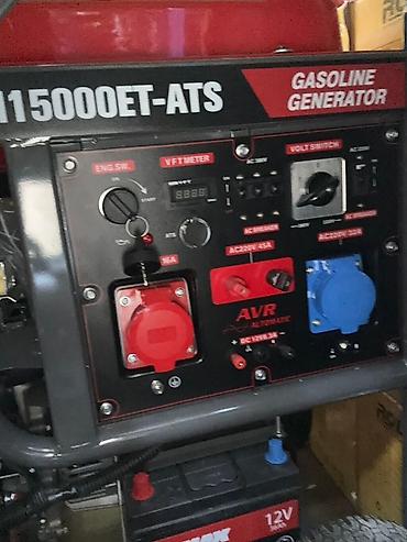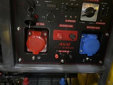 Бензиновый генератор D-MAX DM15000ET-ATS, оснащенный колесами для удобства перемещения. Модель имеет красный топливный бак и серый корпус с перфорированными панелями для вентиляции. На панели управления расположены различные разъемы, включая AC220V 45A и AC220V 32A, а также вольтметр и переключатели. Устройство предназначено для автономного электроснабжения.