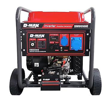 Бензиновые генераторы D-MAX — линейка переносных электростанций с колесной рамой, электрозапуском (12V аккумулятор в комплекте), цифровым VFT-метром и автоматическим регулятором напряжения AVR. Предназначены для питания 220 В (розетки AC 220V) и 12 В DC, подходят для дома, дачи, строительства и резервного электроснабжения чувствительной техники (инверторная модель).