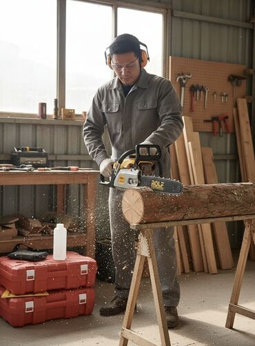 - Мощная цепная бензопила для распила бревен и досок, подходит для заготовки дров и строительных работ.
