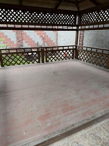 Металлическая беседка/навес с деревянным настилом. - Каркас из профильной трубы, сварные ограждения по периметру. - Крыша из профнастила, двухскатная, защищает от дождя и солнца. - Пол из деревянн...