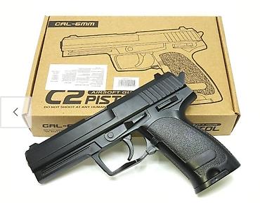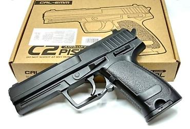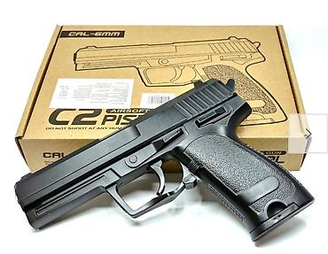 Игровая модель детского металлического пневматического пистолета С.2 - это уменьшенная копия настоящего оружия. Пистолет изготовлен из нелегкого металла и качественного АБС-пластика с прочной металлической пружинной системой, магазин вмещает около 11 патронов 6 мм BB. На рукоятку нанесена нескользящая текстура, предотвращающая скольжение пистолета в руках.