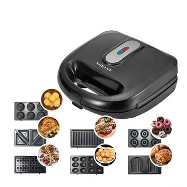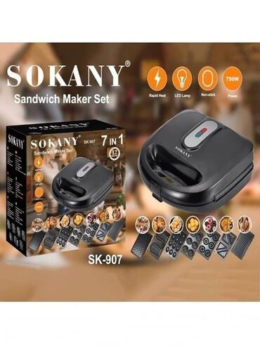 Вафельница электрическая SOKANY SK - 907 7в 1 - это многофункциональный мультипекарь, который за считанные минуты приготовит горячие бутерброды с самыми разнообразными начинками, пышные вафли, сэндвичи, печенье орешки, мадлен и пончики. Мультипекарь оснащен семью сменными пластинами, размером 12х22 см. Благодаря антипригарному покрытию каждый лист после использования легко мыть. 7 сменных панелей в комплекте: Грильница (прижимной); Орешница (как советские); Сэндвичница (обычные треугольные); Вафельница (толстые бельгийские вафли, они же венские, брюссельские); Печенница (курабье); Пончики (сушки); Мадлен (ракушка) Потребляемая мощность: 750 Вт Корпус из нержавеющей стали. Мультипекарь; Электрогриль; Вафельница; Сэндвичница;Техника для кухни; гриль электрически
