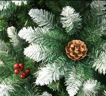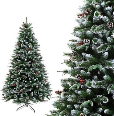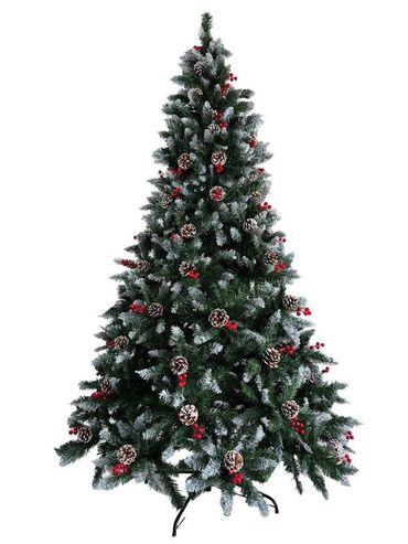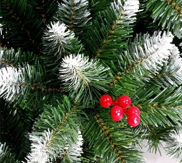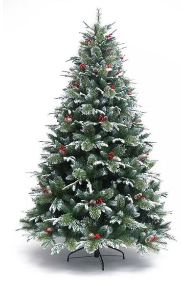 Пышные зелёные ветви густо покрыты лёгким «снегом», а яркие красные ягодки и аккуратные шишки создают атмосферу настоящей зимней сказки. Ёлка имеет идеальную коническую форму, выглядит как живая и не требует ухода. Прочная металлическая подставка обеспечивает устойчивость, а плотная хвоя делает дерево максимально реалистичным и объёмным.