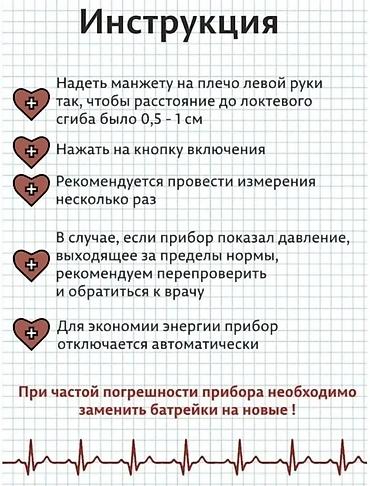 Тонометр оснащен большим дисплеем, на котором отображаются время измерения, пульс и давление. Благодаря встроенной памяти прибор способен запоминать последние 99 значений. Для того, чтобы тонометр показал корректные измерения, необходимо выполнить некоторые рекомендации: