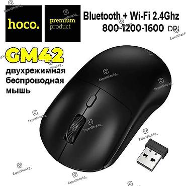 Беспроводная мышь Hoco GM42 — это компактная двухрежимная модель с возможностью подключения через USB-адаптер 2.4 ГГц или Bluetooth.