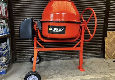 - ALFAIR — классическая мобильная бетономешалка на колёсной тележке; барабан с зубчатым венцом, большой маховик для точного позиционирования и опрокидывания, электрический двигатель под боковым защитным кожухом.