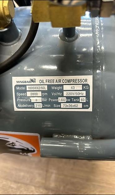 Безмасляный воздушный компрессор Mingbao 1600WX2/60L. Оборудован двумя двигателями, работает от сети 220В/50Гц. Объем бака составляет 60 литров. Компрессор обеспечивает давление до 8 бар и производительность 210 л/мин. Скорость вращения 2800 об/мин. Габариты устройства 73x36x62 см, вес 43 кг. Подходит для использования в различных сферах, где требуется чистый сжатый воздух без примесей масла.