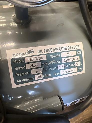 Безмасляный воздушный компрессор MINGBAO модели 1600W30L. Этот компрессор имеет мощность 1.6 кВт, скорость 2800 об/мин ипроизводительность 105 л/мин. Рабочее давление до 8 бар обеспечивает эффективную работу. Объем ресивера составляет 30 литров, а его размеры — 56x24x49 см, что делает его достаточно компактным. Устройство весит 23 кг и работает от сети 220В/50Гц. Идеально подходит для задач, требующих чистого воздуха без примесей масла.