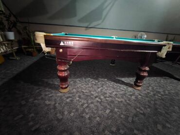 - Борта: деревянные, с латунными уголками и накладками на лузах.