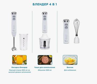 Погружной блендер. Блендер. Midea MC-BL401 С его помощью у вас получится быстро измельчить и перемешать любые ингредиенты для коктейля, супа-пюре и других блюд. Все части блендера (кроме корпуса...