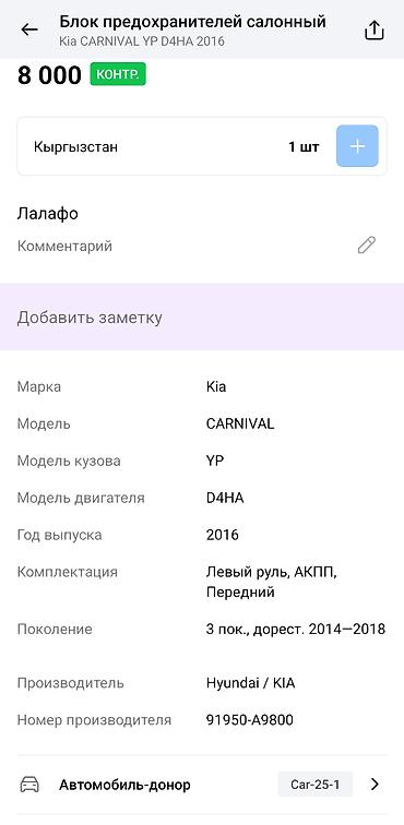 - Подходит для Kia Carnival/Grand Carnival (кузов YP). На фото — модуль с маркировкой YP, донор — Kia Carnival 2016, двигатель D4HA, передний привод, АКПП, левый руль.