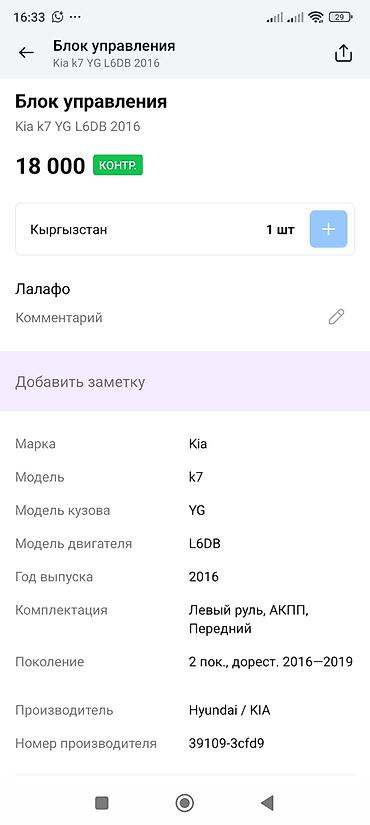 - Совместимость: Kia K7 (YG), поколение 2, дорестайлинг 2016–2019, передний привод, АКПП, левый руль