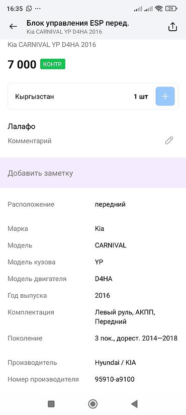 - Применяемость: Kia Carnival (YP, 3‑е поколение, дорестайлинг 2014–2018), двигатель D4HA, 2016 г. (совместимость уточняйте по номеру 95910-A9100)