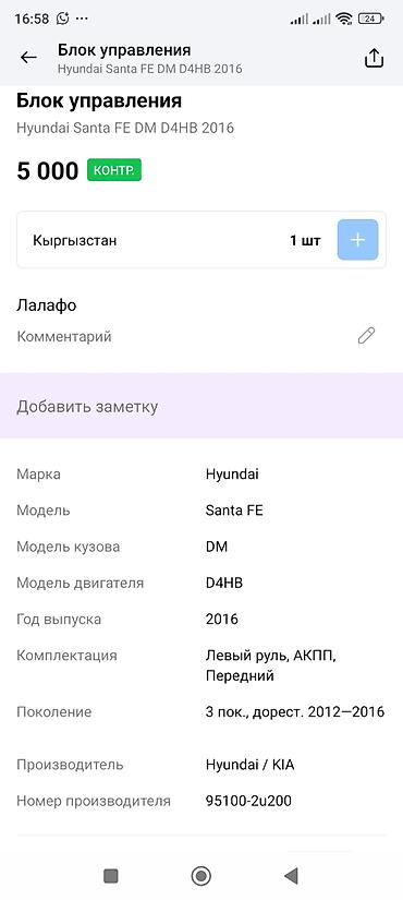 - Совместимость по данным с карточки: Hyundai Santa Fe DM, двигатель D4HB, 3‑е поколение дорестайлинг 2012–2016, год 2016, левый руль, АКПП, передний привод