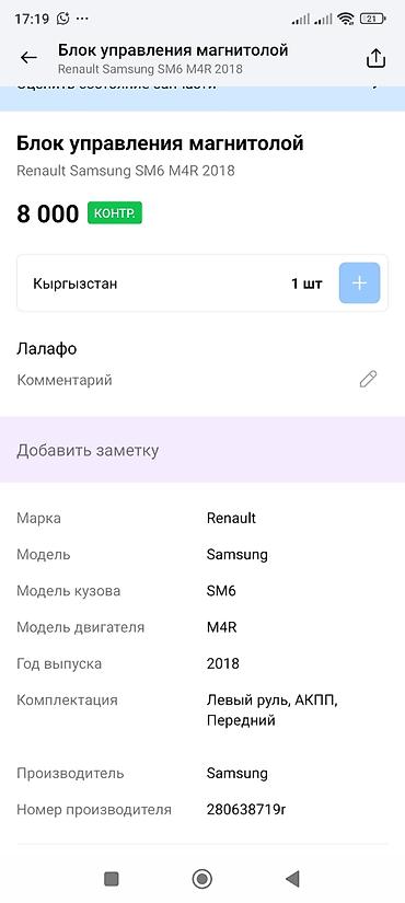 - Совместимость: Renault Samsung SM6 (двигатель M4R, левый руль, АКПП, передний привод — согласно карточке)