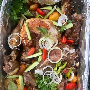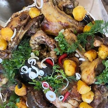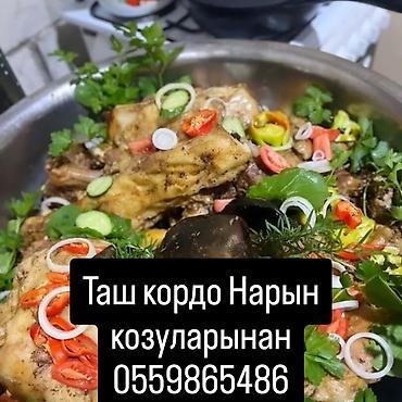 Традиционное блюдо «Таш кордо» (нарын): ассорти из ароматного баранины запечённое в собственном соку с золотистой корочкой. Подаётся крупными сочными кусками с печенью и головизной, дополнено картофелем, луком, зеленью, острым перцем, огурцом и томатами.
