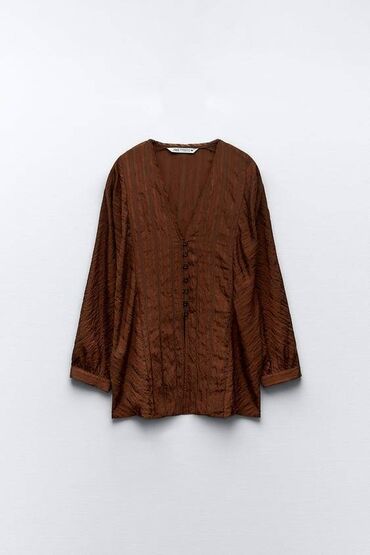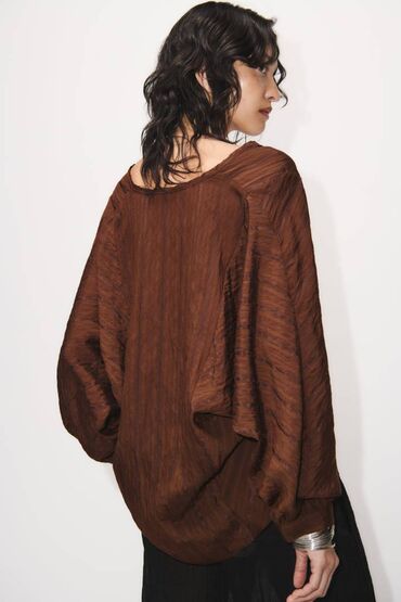 Женская блузка свободного кроя, Турция. Цвет: черный. V‑образный вырез с мягкой драпировкой, завязка-нить по центру. Длинные объемные рукава с присборенными манжетами. Легкая струящаяся ткань, асим...