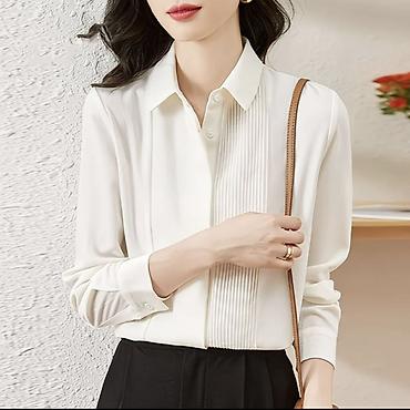 - Модели: офисные и повседневные рубашки на пуговицах с отложным воротником; варианты с гладкой планкой, аккуратной плиссировкой по полочке и свободным oversize-силуэтом.