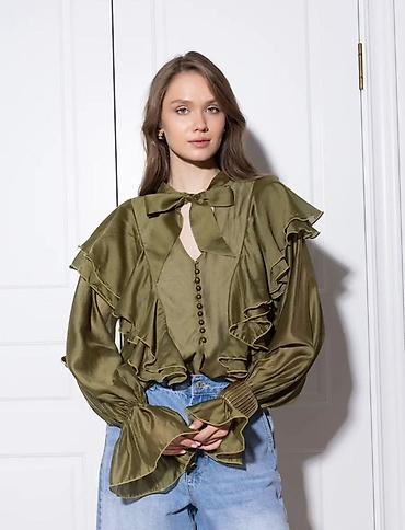 - Дизайн: выразительные многоярусные воланы спереди и по линии плеч, декоративная планка с обтяжными пуговицами, вырез-капля с завязкой-ленточкой у горловины, объёмные рукава с присборенными манжетами-воланами.