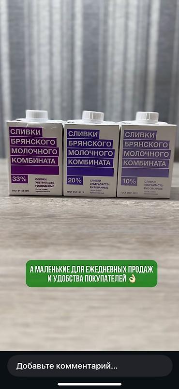 - Сливки «Брянского молочного комбината» ультрапастеризованные, ГОСТ 33. Жирность: 10%, 20%, 33% Картонные пакеты с крышкой. Подходят для соусов, кофе, десертов и взбивания (в зависимости от жирности).