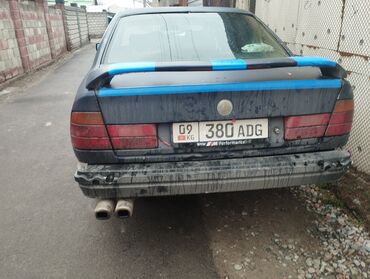 BMW 5 Series E34, седан, темно‑синий цвет. Классическая «пятёрка» с культовым дизайном: фирменная решётка радиатора с четырьмя круглыми фарами, длинный капот, ровная крыша и строгая корма. На машине установлены легкосплавные диски, спереди и сзади — пластиковые бамперы, сдвоенный выхлоп, задний спойлер. Четыре двери, просторный салон, багажник с широкой крышкой. Зеркала и молдинги в цвет кузова, хромированная окантовка стёкол. Автомобиль на киргизских регистрационных номерах (KG), задняя рамка с логотипом BMW M Performance.