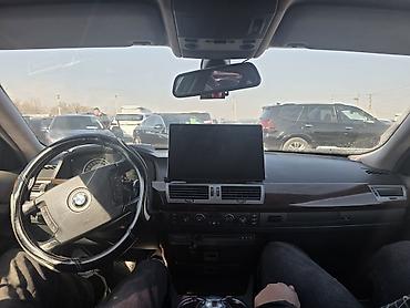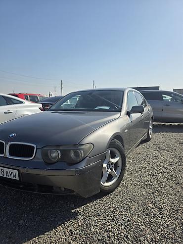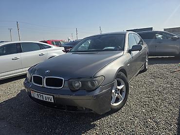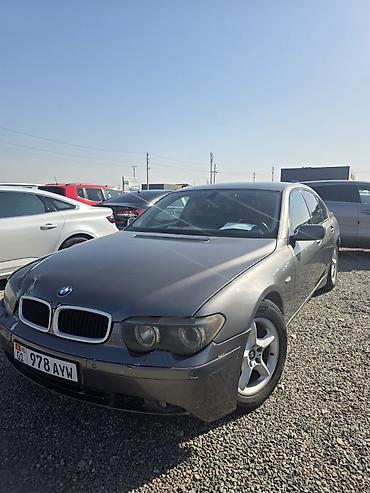 BMW 7 Series (E65) седан, темно‑серый цвет. Киргизские номерные знаки KG 01 (978 AYW). Кузов с заводским антенным «плавником» на крыше и тонированными стеклами. Литые диски BMW на 5 шпилек, задние ...